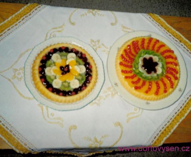 Vpravo kompotované broskve, kivi, banán, ostružiny a paprsky z červeného rybízu. Vlevo více ostružin a mnohem méně broskví. Kvalita fotky snížena skenováním z papírového originálu.
