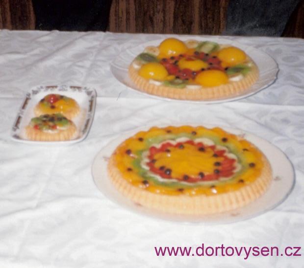 Kompotované broskve, kivi, banán, jahody a borůvky. Pokusně i dva miniaturní skleněné koláčky, ale větší ovoce na nich není tak pěkné. Kvalita fotky snížena skenováním papírového originálu.