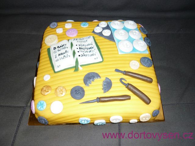 Světlý korpus, čokoládový máslový krém, mirabelková marmeláda, fondán.