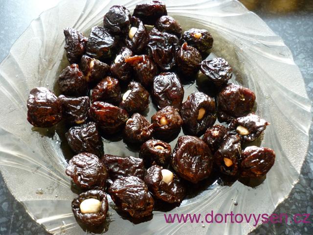 Den předem si na mělkou misku rozložíme sušené švestky a přelijeme trochou griotky. Přetáhneme potravinovou fólií a dáme třeba do lednice nebo můžeme nechat i na stole v kuchyni. Druhý den rozbalíme a do každé změklé švestky vložíme bílou mandli.