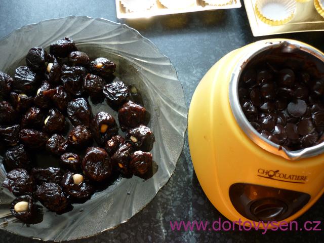 Pomalu si rozehřejeme čokoládu, stačí jen aby byla tekutá, není třeba ji hřát příliš. Naplněnou švestku napíchneme na párátko a omočíme zcela ze všech stran v čokoládě. Položíme na mřížku okapat a hned vytáhneme párátko.