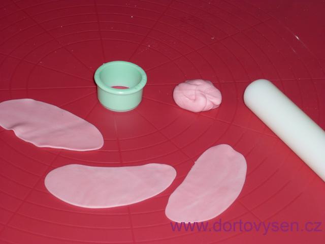 Šunka je jen růžový fondán. Ze silnějšího plátu jsem vykrojila kolečka a rozválela je do tenka.