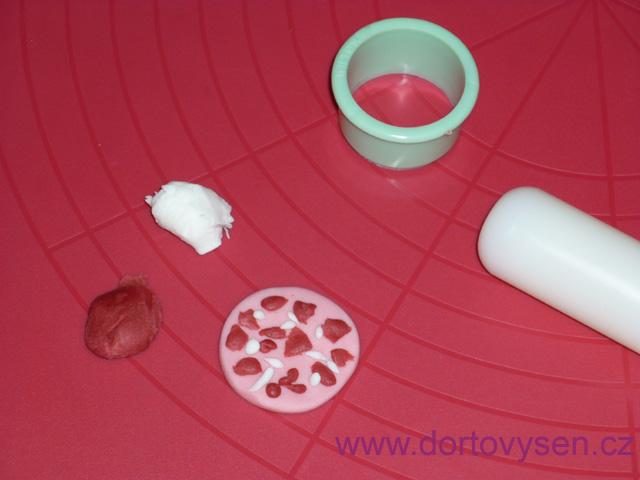Salám jsem udělala z růžového kolečka, na které jsem nadrobila červený a bílý fondán. Pak jsem kolečko rozválela do tenka.