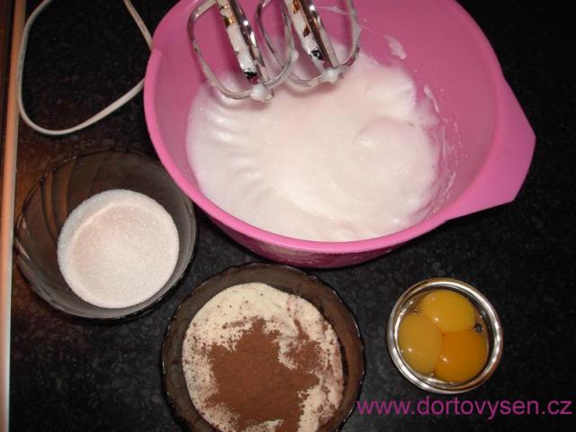 Do menšího pekáčku stačil piškot ze 3 vajec. K nim 110g hrubé mouky, 10g kakaa a 75g cukru krupice. Nic víc. Nejprve jsem ušlehala sníh z bílků se špetkou soli.