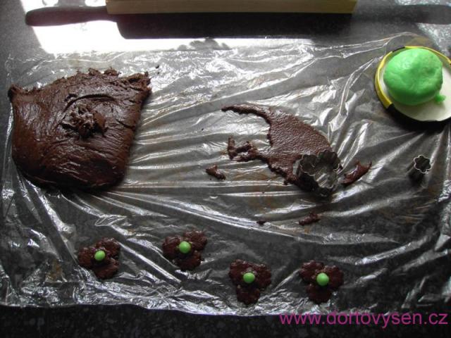 Mezitím, co se korpus chladil, jsem si připravila čokoládovou potahovací hmotu: Nad párou jsem rozpustila 200 g čokolády na vaření (pozor, voda se nesmí vařit), pak do ní přimíchala necelé 4 lžíce pšeničného sirupu. Vznikla nádherná pružná hmota, kterou jsem dala do potravinářské fólie a nehla vychladnout. (Má se prý nechat tak 2 hodiny, ale já to nevydržela a pracovala jsem s ní už asi za půl hodiny. Rozválela jsem ji a vykrájela tvary, které jsem kombinovala se zelenou mléčnou hmotou.