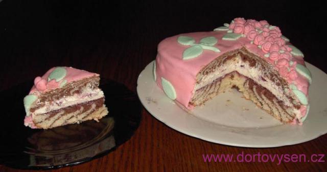 V řezu je krásně vidět mramorování těsta (po upečení jsem korpus otočila, proto je mramorování obráceně) i vysoká vrstva krému. Dort všem chutnal, jen byl poměrně dost sladký.