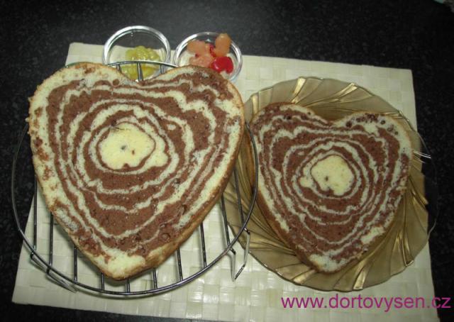 Poprvé jsem zkoušela udělat geniální mramorový korpus. Z ušlehaného piškotového těsta jsem odebrala třetinu, do té přidala kakao, až byla hezky tmavá. Do připravené formy jsem dala lžíci tmavého těsta, na ně 2 lžíce světlého těsta, na to zase 1 lžíci tmavého a na ně 2 lžíce světlého. Tak jsem to opakovala s celou dávkou těsta. Těsto se samo rozlilo do takového nádherného vzoru.