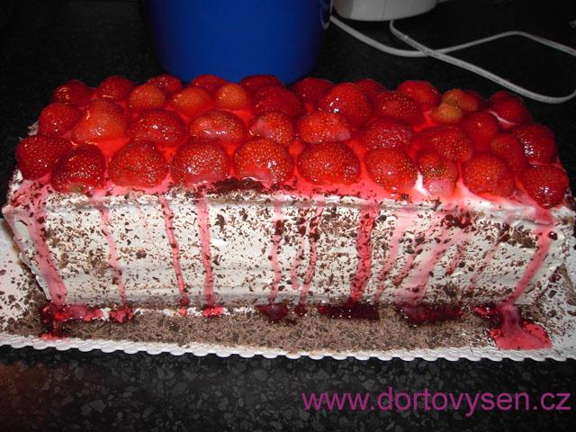Horní vrstvu jahod jsem zalila dortovou želatinou, která také částečně stekla po bocích dortu. Nejprve jsem se rozhodla to tak nechat...
