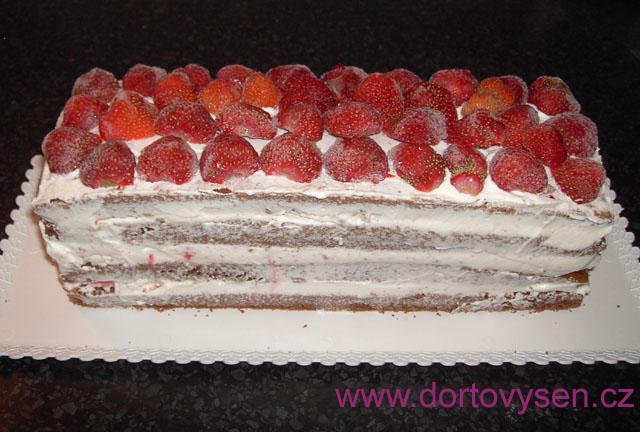 Poslední vrstvu jsem pokladla půlkami jahod a celé po stranách pomazala tvarohovou šlehačkou. Dala na cca 2 hodiny do ledničky vychladit a zatuhnout.