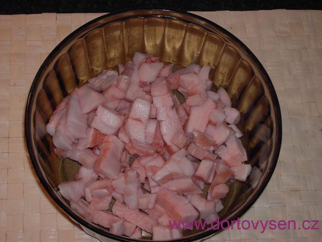 V tomto případě jsem škvařila jen půl kila syrového sádla, ale lze samozřejmě i větší množství najednou. Potřebujeme velkou varnou mísu s víkem - nejlépe Simax. Sádlo nakrájíme na kostičky - já jsem zvyklá dělat menší cca 1 cm kostičky. Vložíme do suché mísy. Žádnou vodu nepřidávám.