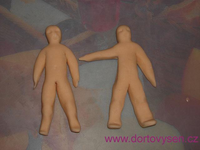Figurky jsem si upatlala z hmoty White icing asi týden dopředu a nechala vytvrdnout. Každá je z jednoho kusu - válečku -vymodelovaná ručně. Na oči jsem vymáčkla kosticí malé jamky. Nohy mohly být štíhlejší, ale nedařilo se to líp :-)