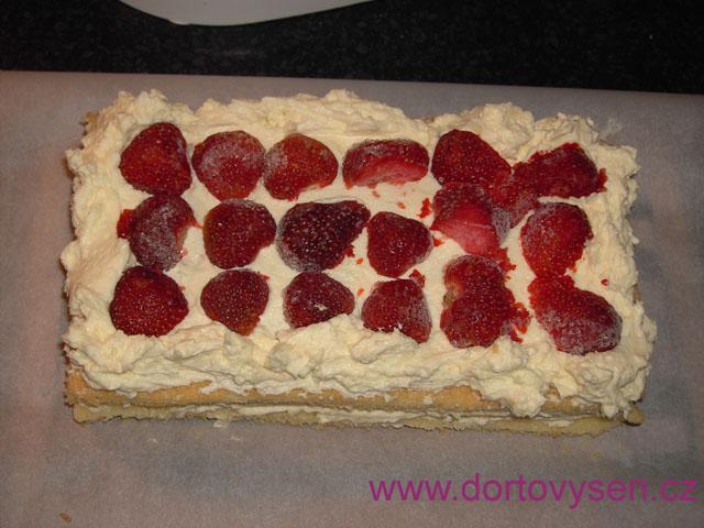 Na každý plát jsem nakladla půlky jahod. Naivně jsem si připravila jeden kompot, takže už po první vrstvě jsem věděla, že budu muset vybalit zmrazené jahody :-) Naštěstí jsem jich měla dost. Další pruh jsem pomazala slabou vrstvou krému a přiklopila na jahody