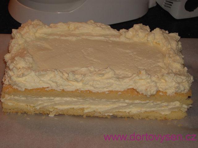 Na pruh těsta jsem namazala slabou vrstvu krému a po okrajích trochu vyšší. Neměla jsem po ruce trezírovací sáček, tak jsem to napatlala příborovým nožem :-)