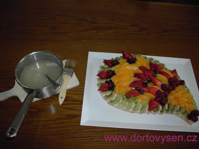 Želatina připravená na použití. Okraje dortu nejprve potírám štětcem a na plochu nalévám želatinu lžící. Nikdy se mi nestalo, že by mi želatina protekla. Na chladném ovoci rychle tuhne.