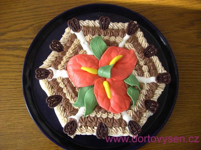 Lehký piškot bez tuku a prášku do pečiva ve tvaru šestiúhelníku, pařížská šlehačka, bílá šlehačka, banány a antúrie z belgického fondánu White icing.