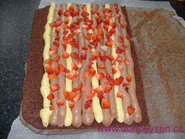 První bylo naplnění části plátu krémem a jahodami