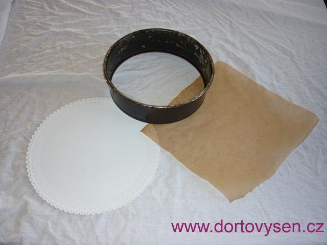 Připravíme si kruh na pečení a buď i spodek formy (dno) nebo rovný tác nebo větší talíř. Dno vyložíme pečicím papírem. Pokud budeme dělat dortík rovnou na tác, na kterém budeme posléze podávat, tak papír dávat nemusíme.