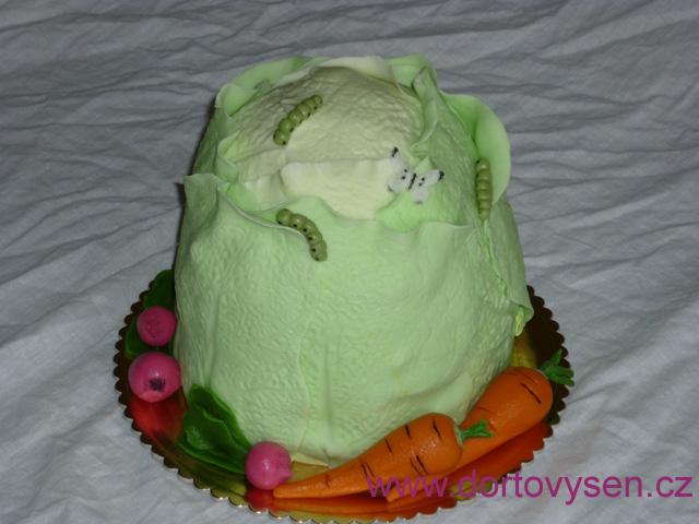 Světlý korpus, krém máslový ze smetanového pudinku s bílou schokobellou (měkká bílá čokoláda) a višňový frutafill (jemný ovoný gel s celými višněmi - lahůdka!) Listy zelí jsou z belgického fondánu, mrkve a ředkvičky z pravého mandlového marcipánu.