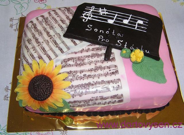 Oříškový korpus, krém máslový s vanilkovým pudinkem a bílou čokoládou, ananasový kompot. Potažení a zdobení květinami z maďarského fondánu, stojan na noty z fondánu s belgickou čokoládou. Bílé listy s notami jsou z čokolády na kterou je nanesen obrázek z kokosového tuku - tzv. transferfólie.