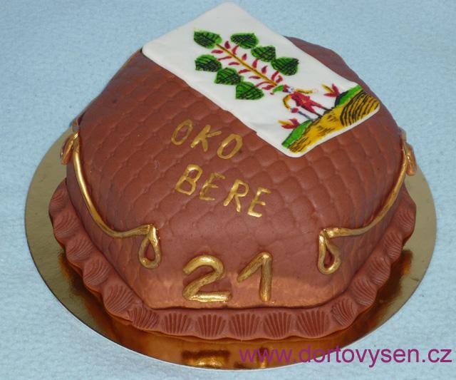 Kakaový korpus, višňový frutafill (gel plný višní), pistáciová šlehačka. Kartu jsem malovala potravinářskými barvami na fondán.