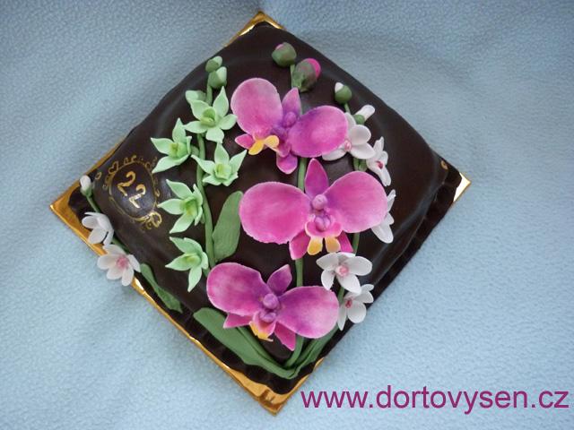 Korpus kakaový, střídaná pařížská a bílá šlehačka, potažení Čokoflex. Orchideje kombinace Smartflex Velvet a K2.