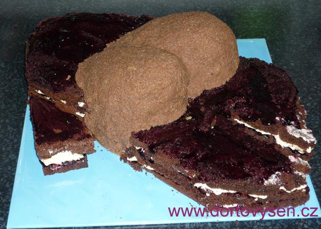 Zadek jsem rukama vytvarovala z punčoviny ze zbytků světlého korpusu srdce a z čokoládového krému. Uhlazovala jsem jen rukama.
