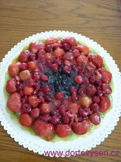 Nízký lehounký piškot, šlehačka s lesním ovocem a smetanovým tvarohem, kivi, jahody, maliny a borůvky pod želatinovým přelivem. Žádné velké dortové umění, ale zase to, co má můj syn nejraději :-)
