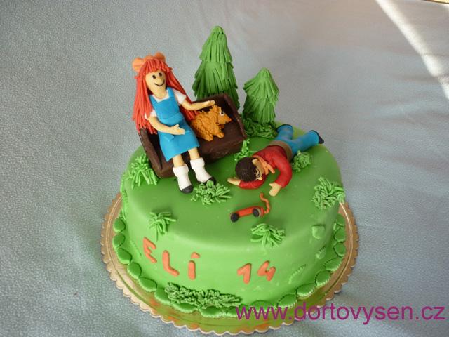 Světlý vanilkový korpus, brusinkový džem, šlehačka v chuti lesní ovoce, prosypaná mraženými malinami a borůvkami. Potažení a ozdoby maďarský fondán a mléčná modelovací hmota.