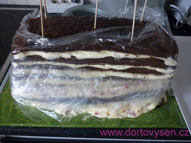 Zde je vidět, že i přes mou snahu, kdy jsem promazaný dort obalila potravinovou fólií, dolemi stejně vanilková šlehačka s tvarohem a kousky jahod vytekla :-(