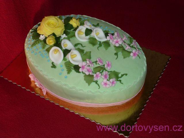 Střídaný korpus kakaový ořechový a světlý vanilkový, prokapané meruňkovou šťávou, meruňkový frutafill, kompotované meruňky, belgický fondán. Květiny jsou na dort naskládány a přilepeny rozředěnou hmotou, nikde žádný drátek.