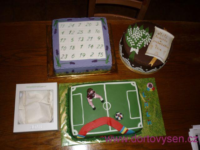 A jedna fotka tří dortů, které jsem dělala v jednom dni :-) V krabičce jsou zvlášť na cestu připraveny branky k fotbalovému hřišti.