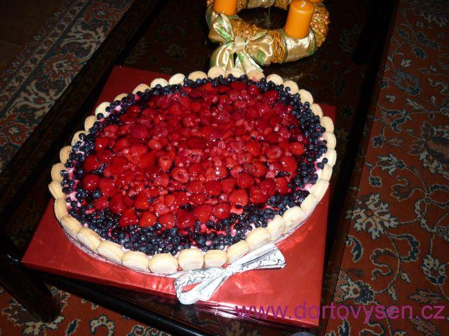 Ovocný ovál - vanilkový nízký korpus, krém ze šlehačky, zakysané smetany, bílého jogurtu a vanilkového pudinku Olé. Borůvky, maliny, řelatina, cukrářské piškoty.