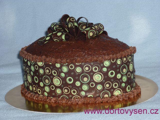 Čokoládový oválek - kakaový korpus, meruňkový frutafill, čokoládový máslový krém, povrchový kopeček z čokolády se zakysanou smetanou, mašle a obvod z čokolády.