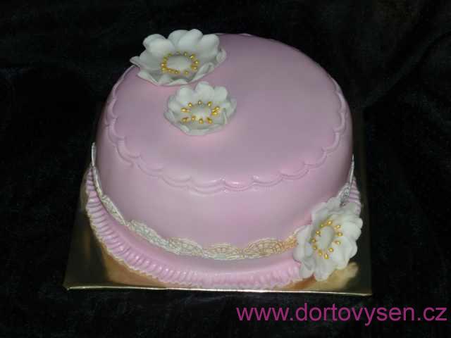 Citronový korpus prokapaný pomerančovým džusem, malinová šlehačka, směs mraženého lesního ovoce, belgický fondán stříkaný airbrushem. Jedlá krajka Sweet lace.