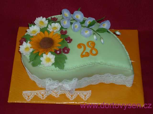 Kakaový korpus prokapaný vaječným likérem, máslový pudinkový krém v chuti vanilka - vaječný likér, kompotované broskve, belgický a maďarský fondán, jedlá cukrová krajka.