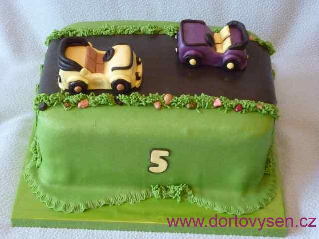 Kakaový korpus, prolitý jahodovým džusem a rumem, odlehčený máslový čokoládový krém, jahody, belgický fondán. Autíčka ze sušenek Siesta.