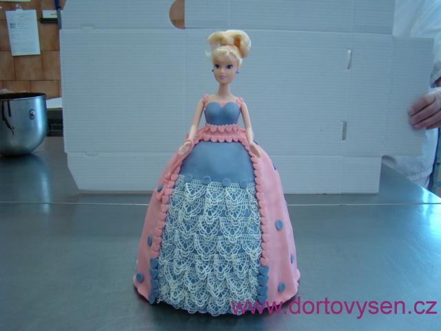 Světlý vanilkový korpus, borůvkový Delifruit - lahůdkový gel s ovocem, mražené borůvky, šlehačka s vanilkovým pudinkem. Potažení a zdobení belgický fondán, jedlá cukrová krajka, panenka je z plastu.