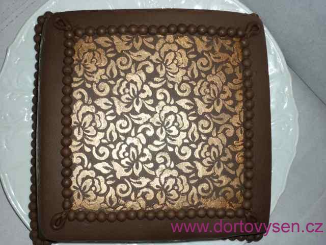 Kakaový korpus, jahodová marmeláda rozmíchaná s rumem, prostřídaná bílá a čokoládová šlehačka, belgický fondán s belgickou čokoládou a kakaem, ručně zlatem malované zdobení přes šablonu (stencilu).