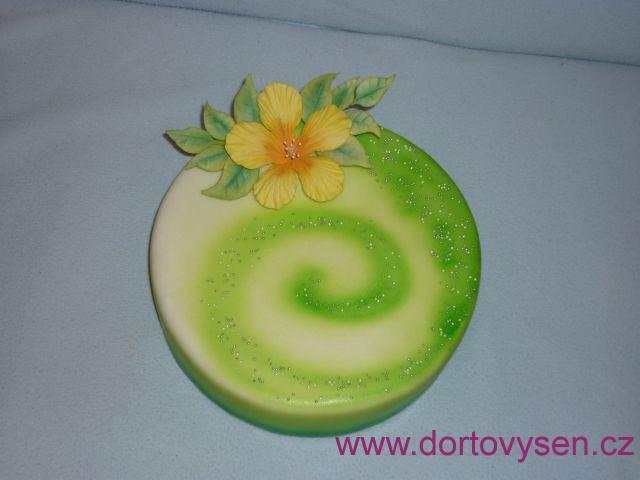 Korpus Red Velvet, meruňkový frutafill, karamelový máslovo-pudnkový krém s ořechy. Potah belgický fondán, květina na drátku z maďarského fondánu.