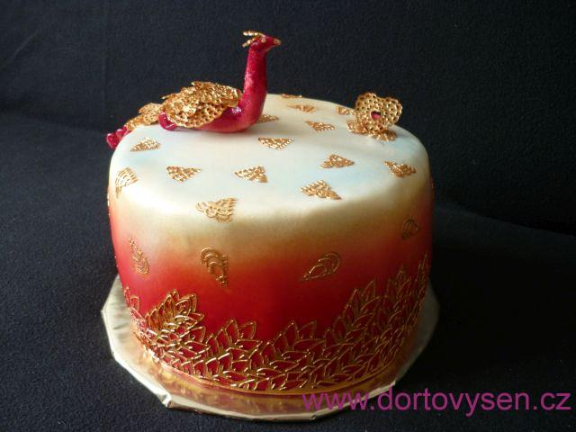 Dortík do soutěže na cukrářský sraz. Téma bylo Orient. Kakaový korpus, promazaný jahodovým frutafillem se spoustou jahod a tvarohovo-jogurtovým smetanovým krémem. Potažení belgickým fondánem, ptačí ozdoba z mléčné hmoty, jedlá krajka.