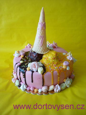 Emča má každý rok zajímavý nápad na svůj narozeninový dort. :-) Letos si vybrala "rozteklou zmrzlinu" :-) Celý dort je bezlepkový, korpus z pohankové mouky, vanilkový šlehačkový krém, jahody, banány. Dozdobeno maďarským fondánem, bonbonky a čokoládovou ganache.