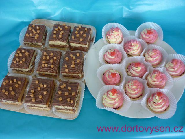 Čokoládovo karamelové řezy, košíčky s jahodou a malinovo-vanilkovou šlehačkovou náplní